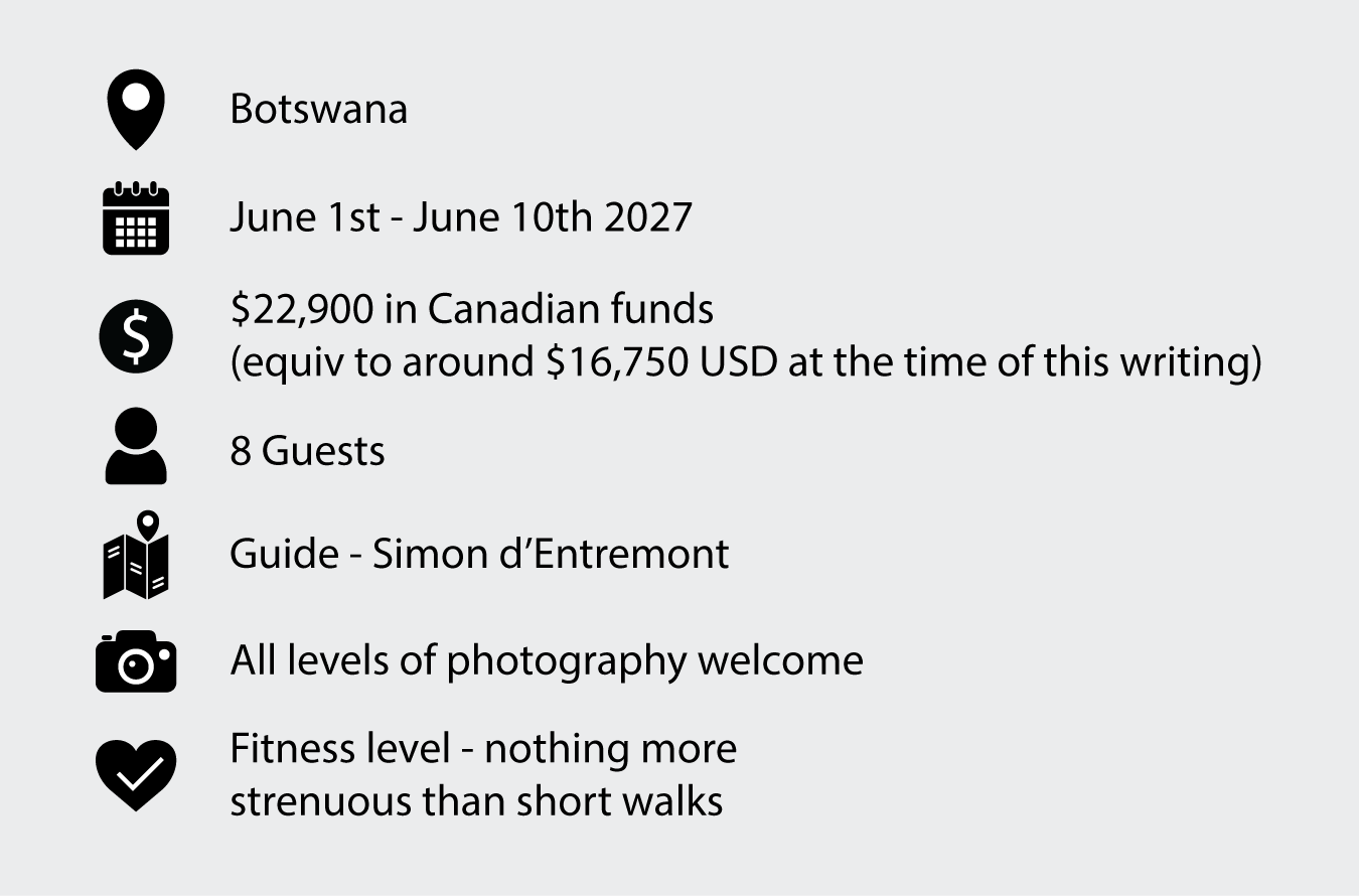 Due to the limited availability of accommodations, my Botswana tour from June 1-10th for 2027 is double-occupancy only. You and a partner can travel together, or I can pair you with another client.